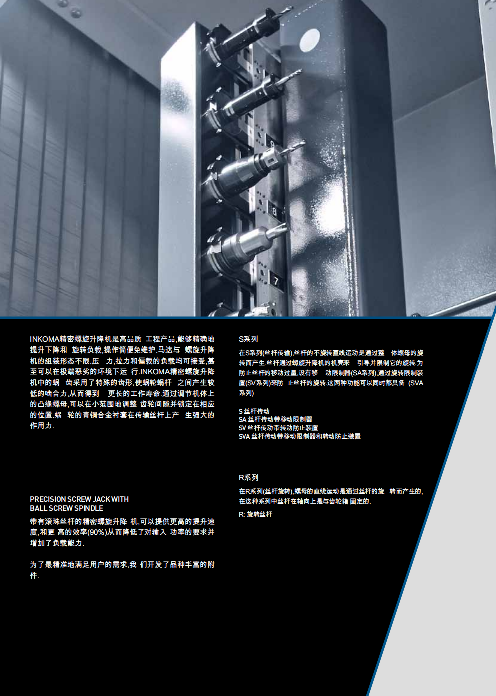 INKOMA精密螺旋升降机是高品质 工程产品,能够精确地提升下降和 旋转负载,操作简便免维护,马达与螺旋升降机的组装形态不限.压 力,拉力和偏载的负载均可接受,甚至可以在极端恶劣的环境下运 行.INKOMA精密螺旋升降机中的蜗 齿采用了特殊的齿形,使蜗轮蜗杆之间产生较低的啮合力,从而得到 更长的工作寿命,通过调节机体上的凸缘螺母,可以在小范围地调整 齿轮间隙并锁定在相应的位置.蜗 轮的青铜合金衬套在传输丝杆上产生强大的作用力.