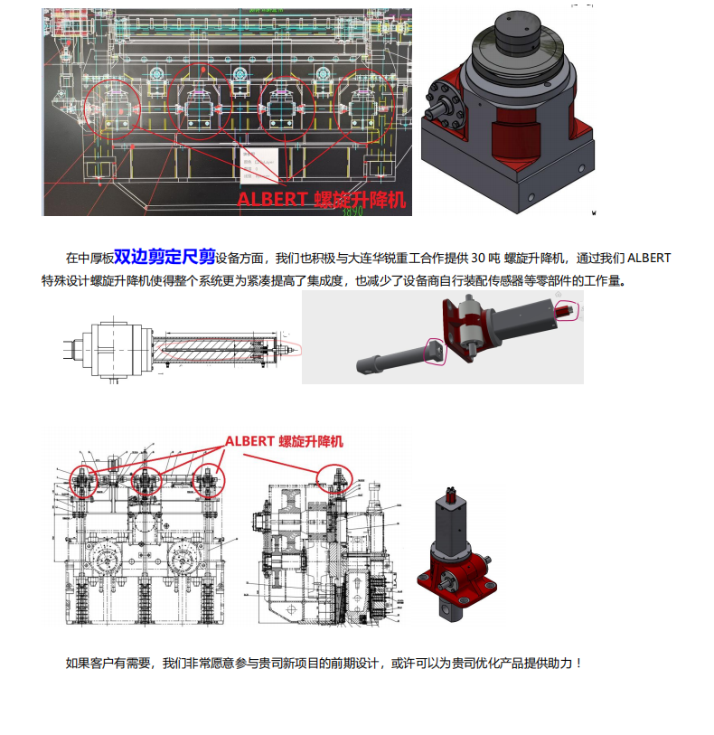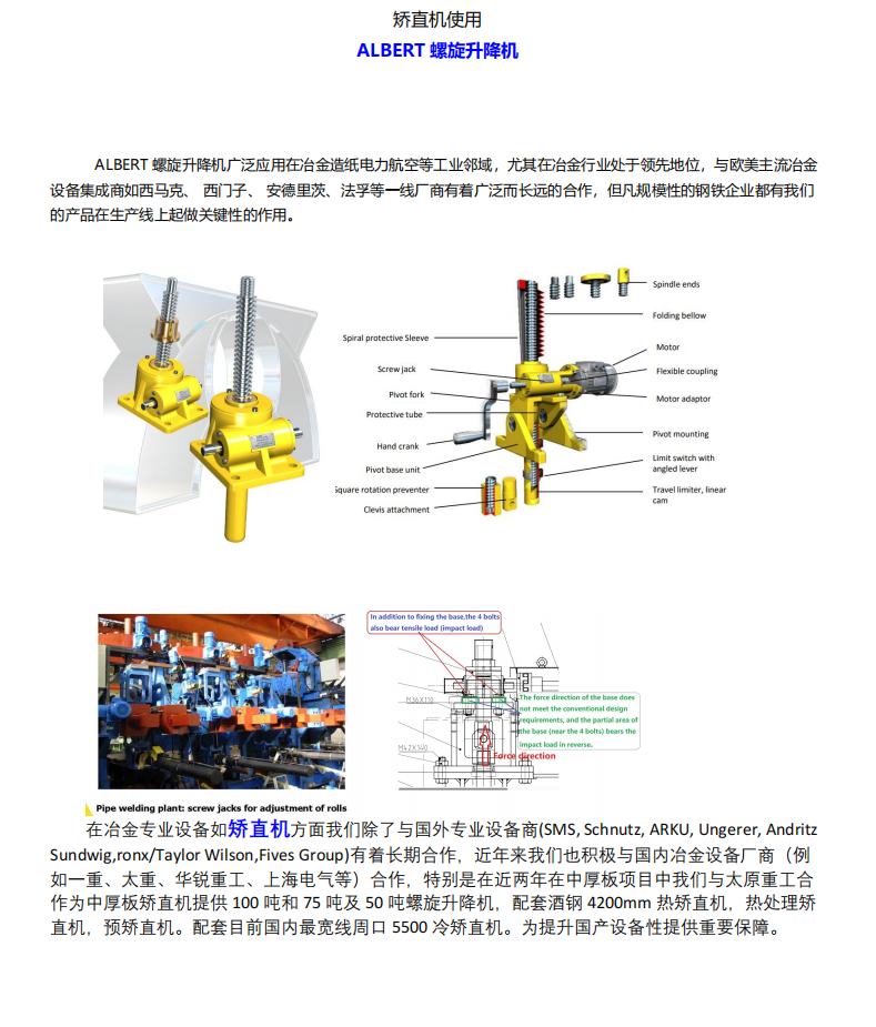 ALBERT螺旋升降机广泛应用在冶金造纸电力航空等工业邻域,尤其在冶金行业处于领先地位,与欧美主流冶金设备集成商如西马克、 西门子、 安德里茨、法孚等一线厂商有着广泛而长远的合作,但凡规模性的钢铁企业都有我们的产品在生产线上起做关键性的作用。